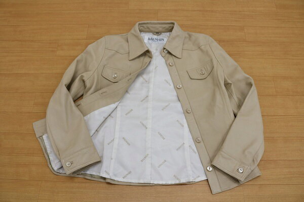 ブランド名:バルマン BALMAIN柄: 色:ベージュ素材:革サイズ:表記無サイズ実寸サイズ:肩幅:約39cm、身幅:約47cm、着丈:約58cm【M相当】状態追記:袖口に僅かな汚れがございますが、比較的綺麗なお品です。