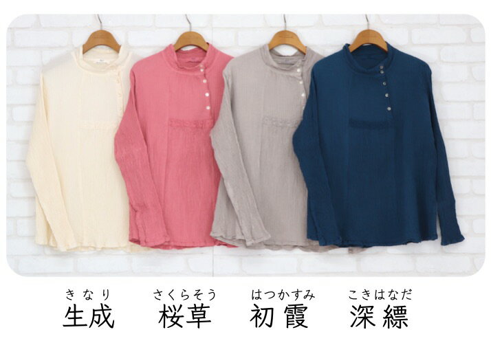 (vol.143カタログp.4 初霞) ●コーディネート商品 カタログ(p.7)→[ラーナシャツ:生成]+[K1123スヌードボレロ:水色] モデル着用(身長162cm)→[ラーナシャツ:初霞]+[ラプラパンツ:深縹]