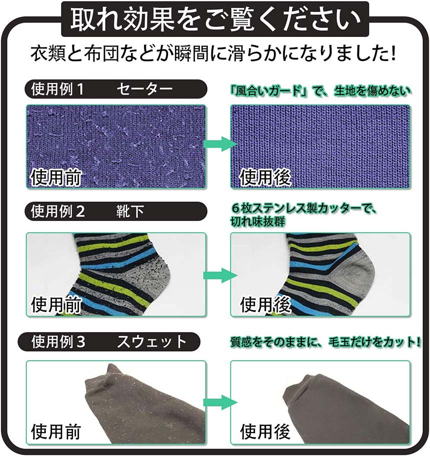 絨毯やカーテンなどといった手強い極太繊維の毛玉も確実に刈り取ることができ、短時間で処理できるようになりました。